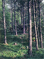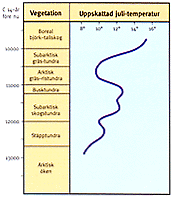 nKlimatet blir åter bättre. Mellan år 10 000 och 9 000 före vår tid börjar sommartemperaturerna att likna de vi har nu. Berget kommer att täckas av sammanhängande björkskog senare med allt mer inslag av tall. nHur vet vi allt detta? Denna del av bergets historia berättas av "mossarna" och deras torvlager. Borrkärnor ur torven analyseras på sitt innehåll av växtdelar och pollenkorn, vilka artbestäms. Även en del insekter finns kvar. Växt- och insektssammansättningen i torven indikerar det rådande klimatet. Tyvärr har man under de senaste århundradena grävt torv i mossarna och på så vis schaktat bort historien efter år 9 000. nÄndå vet vi från undersökningar på andra ställen ungefär vad som skedde. nTallskogen ersattes av lövskog, på Kullaberg i första hand ekskog med al och vide i fuktiga sänkor. |